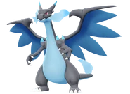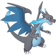 Charizard's Mega Evolution form using Charizardite X is different from Charizard, as it now has a black body color and blue flames from its mouth and on its tail. While using Charizardite Y, Mega Charizard has a big horn on the top of its head and larger wings.