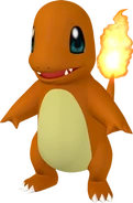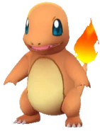 Charmander is a bipedal, reptilian Pokémon with a primarily orange body and blue eyes. Its underside from the chest down and the soles of its feet are cream-colored. It has two small fangs visible in its upper jaw and two smaller fangs in its lower jaw. A fire burns at the tip of this Pokémon's slender tail and has blazed there since Charmander's birth. The flame can be used as an indication of Charmander's health and mood, burning brightly when the Pokémon is strong, weakly when it is exhausted, wavering when it is happy, and blazing when it is enraged. It is said that Charmander dies if its flame goes out. However, if the Pokémon is healthy, the flame will continue to burn even if it gets a bit wet and is said to steam in the rain.