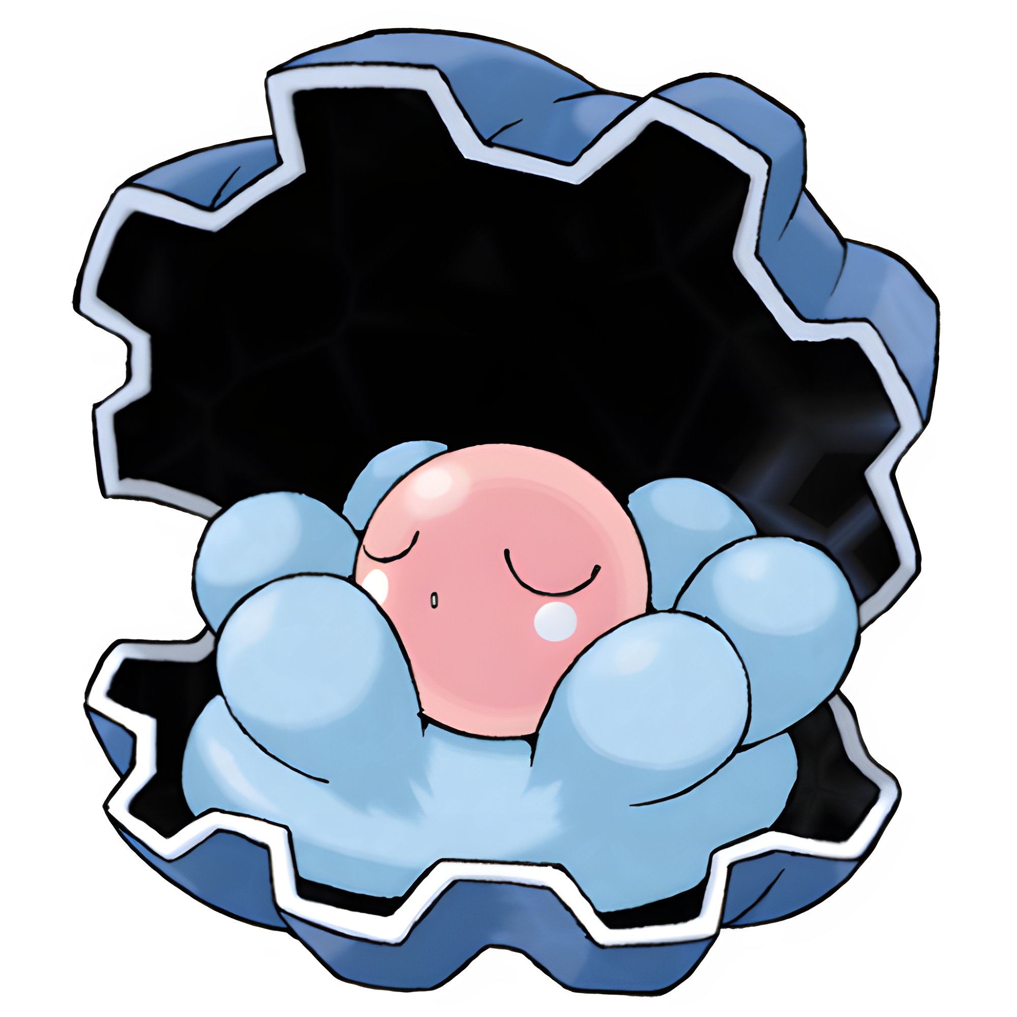 Clamperl is a blue Pokémon with a pink pearl inside of its "mouth". Around the pearl there are little "circles" that hold up the egg.