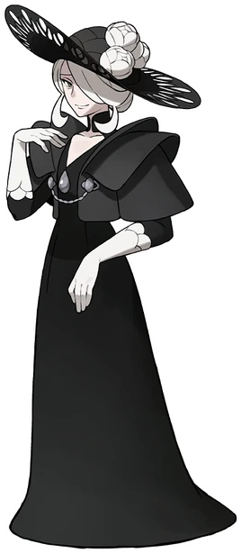 Cogita's attire is a masterful blend of elegance and restraint, evoking a sense of both mourning and majesty. She wears a long, flowing black gown that extends to the floor, its silhouette sleek and sophisticated. The dress features a wide, deep neckline that adds a hint of openness to her otherwise modest appearance. Over her shoulders rests a structured mantle-like layer, its angular design giving her an imposing and regal profile. Her long white gloves contrast sharply with the black fabric, emphasizing her refined hands and movements. The gown is adorned with subtle, dark embellishments near the collar, providing texture without detracting from the simplicity of her ensemble. Completing her look is an elaborate wide-brimmed black hat decorated with a delicate lace-like pattern and more white roses, echoing the adornments in her hair. Altogether, Cogita's clothing enhances her enigmatic presence — dignified, elegant, and steeped in quiet sophistication.