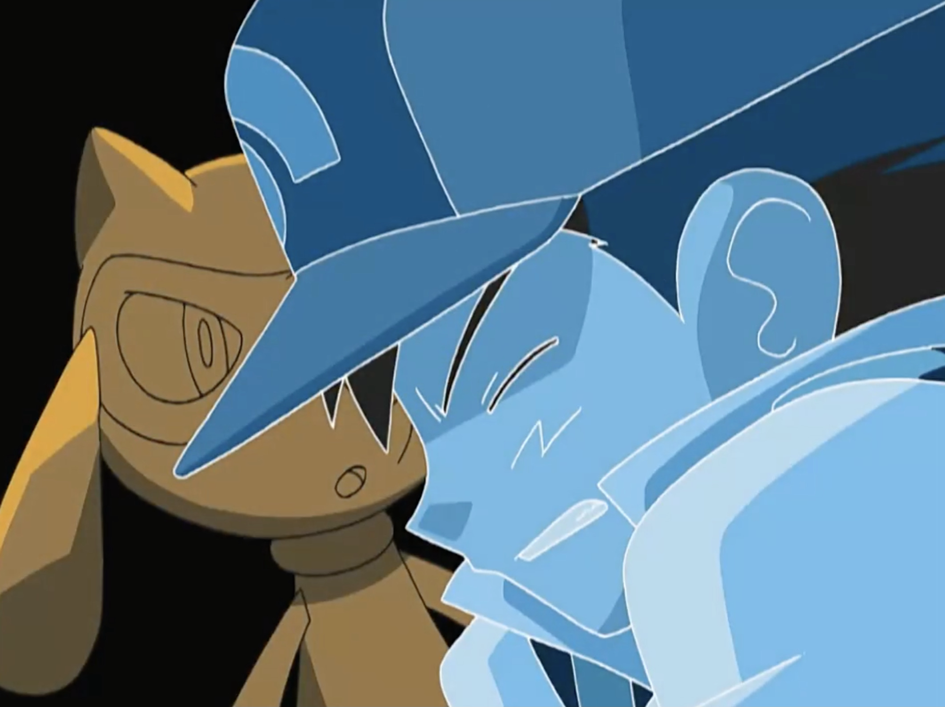 - Part of Ash's hair disappeared in the closing scenes. This can be seen when Ash was talking to Riolu's Trainer.