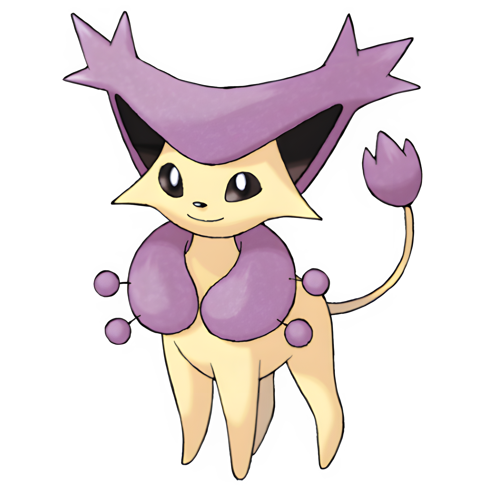 A Pokémon with a yellow and purple fur and a purple ruff like collar with pin like extensions, Delcatty is bigger than its pre-evolved form, Skitty.