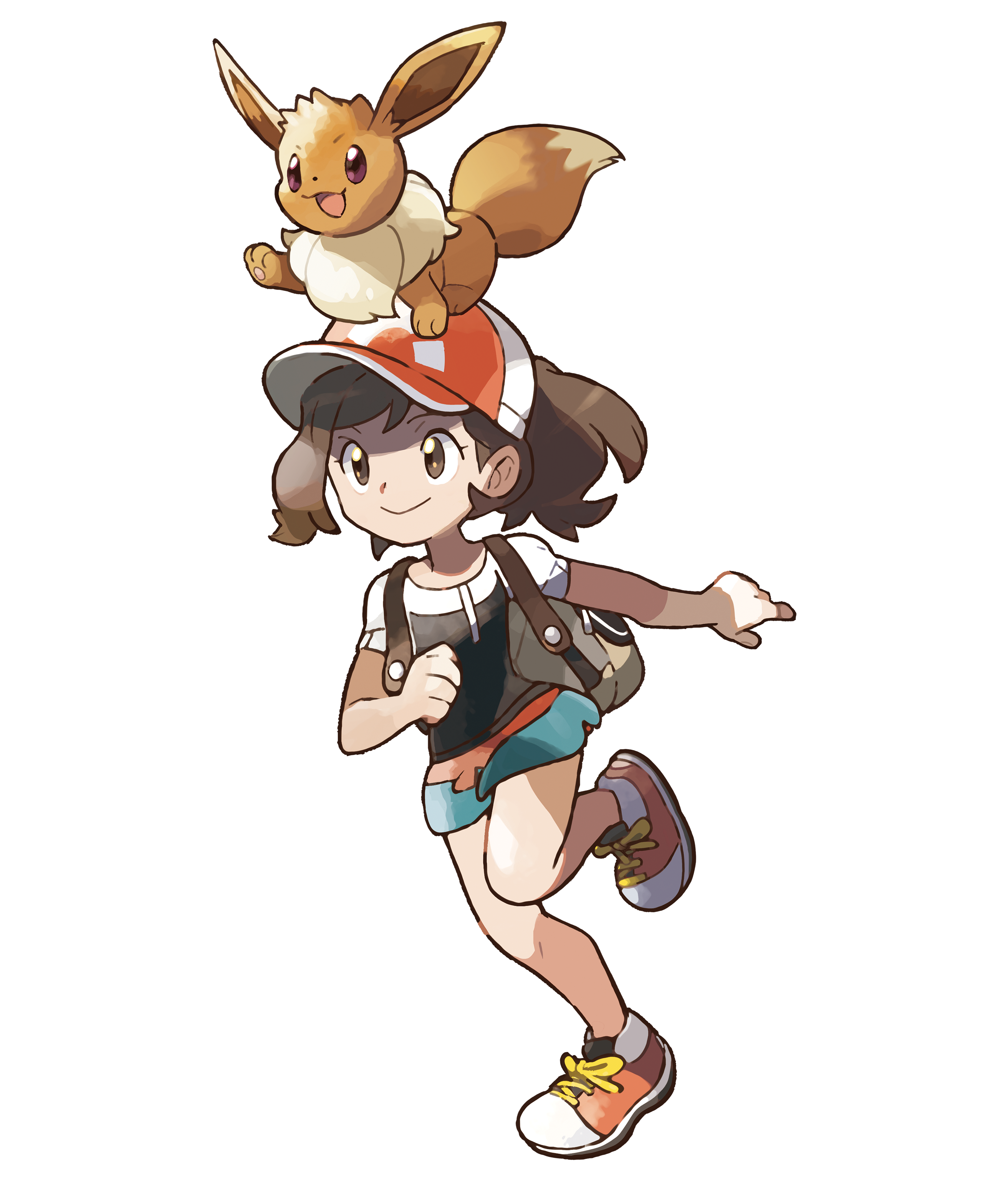 Elaine is a skinny and short young girl with fair skin, brown hair tied into a ponytail, and brown eyes. She wears a red and white baseball cap with a Poké ball logo on it, a black and white t-shirt, blue-green shorts with a red waistband and bow, and orange and white sneakers with yellow shoelaces. She also carries around a light brown backpack. An Eevee is perched on Elaine's head in her artwork.