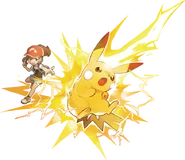When Elaine leaves her house and reaches the outskirts of Pallet Town, she is shocked to see Professor Oak being surrounded by Pidgey. As the Pidgey fly off, Professor Oak greets Elaine. He talks about how he promised to give her a Pokémon that day, but he gets confused when he apparently forgets where he put it. However, opportunity knocks when a strange Eevee or Pikachu shows up at that very moment. Even though she has no Pokémon of her own and is unable to battle it, Elaine is able to capture the Pokémon with Oak's help. After being complimented on her fine performance for a first-timer, Elaine takes Oak's suggestion to nickname her Pokémon and tries to pick up its Poké Ball. Much to Oak's surprise, the Pokémon (still inside its Poké Ball at that very moment) bounces around Elaine for a few moments before it suddenly zooms off towards Oak's lab.