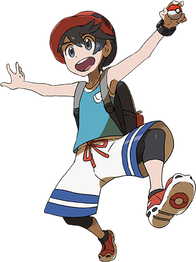 He is shown to be wearing a black baseball cap with a white Poké Ball like symbol planted on the front, also having a blue brim. He has a blue and white striped t-shirt, black and red cargo shorts that lead to blue and teal water shoes, wearing no socks underneath. He sports a gray Z-Ring on his left arm. His appearance is customizable, like that of Calem.