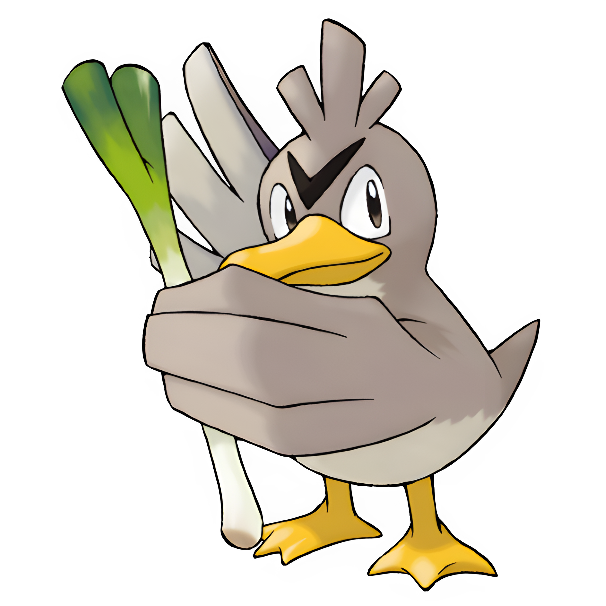Farfetch'd is an avian Pokémon that bears a resemblance to a duck. It is brown in color; contrasted with a yellow bill and white underbelly. The wings of a Farfetch'd show a dexterous quality, as they are equally adapted to manipulate objects much like hands in addition of being used for flight. Farfetch'd has webbed feet, a characteristic common with most ducks. Its face is adorned with a black V-shaped marking along with a trio of feathers that crown its head. It is also holding a leek stalk, which it brandishes as a weapon.