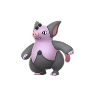 Grumpig is a fat, bipedal, pig-like Pokémon. It has a purple body with black accents, a spiraling tail, two black pearls on its forehead, and one on its midsection.