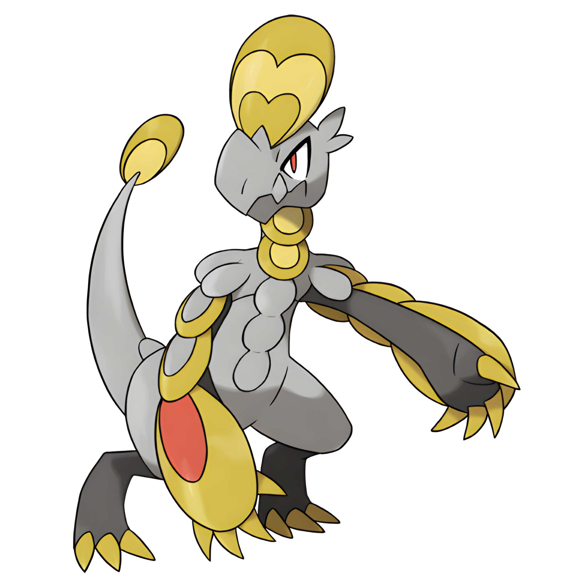 This Pokémon has many scale plates on its body as well. There is a yellow one on its forehead, which is oval with a light yellow, heart-shaped stripe across the middle. Two circular scales cover the front of its neck; both are light yellow with darker edges. The tops of its arms are covered by three overlapping scales. The first two arm scales are gray with yellow trim, but the last scale is red with yellow trim and much larger. At the tip of its tail is a small, circular scale. This last scale has a light yellow portion before ending in a darker yellow.
