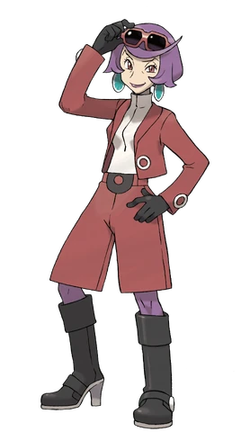 Argenta is a classy and fashionable old woman with fair skin, purple hair, and red eyes. She wears a white turtleneck, a red jacket with gray rings, and long red shorts with a black Poké Ball symbol, along with purple tights and long black boots with tall white heels. To complete her outfit, she wears black gloves, red-framed sunglasses, and circular blue earrings, pairing them all with purple lipstick.