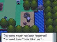 The Hallowed Tower is a small tower resembling a well in Diamond, Pearl, and Platinum, and is the only location where Spiritomb appears. If the player talks to 32 people in the Underground, not including NPCs, the player can then return here to encounter Spiritomb. The tower is located on Route 209. On its unreadable engraving prior to an Odd Keystone is assigned on it.