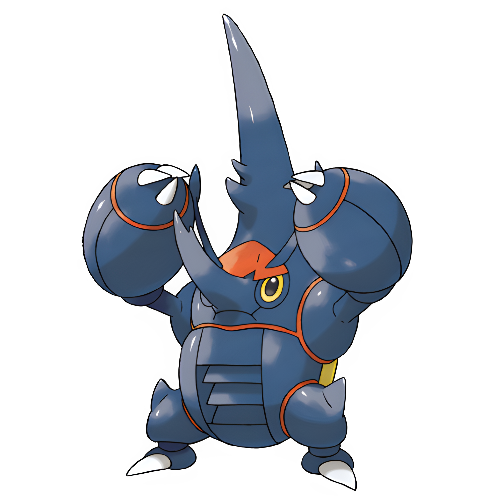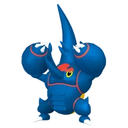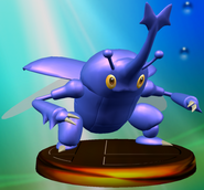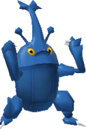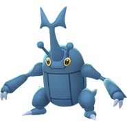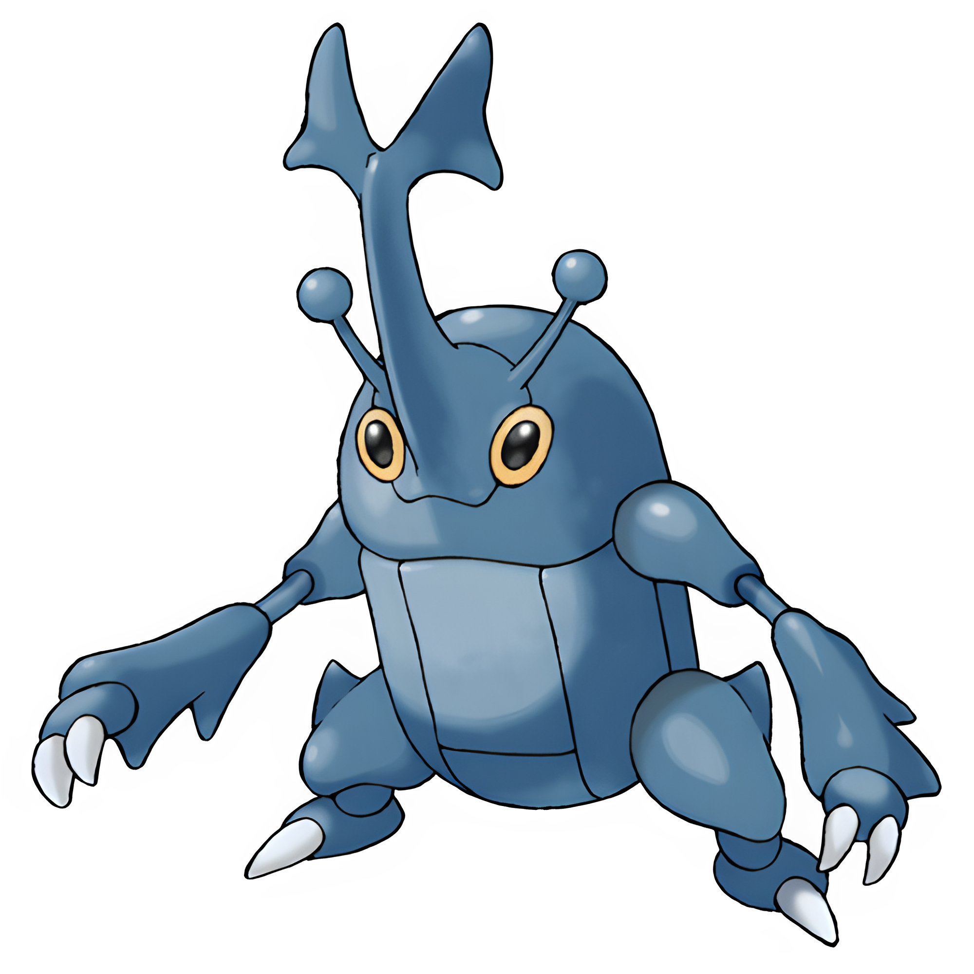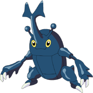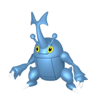 Heracross is a large, blue, winged bipedal beetle-like Pokémon. It has a capsule-shaped thorax similar to Pinsir's, a pair of yellow eyes and two clawed arms and feet. Growing from its head is a large T-shaped horn, which is flanked on either side by a smaller antenna. Heracross' horn shape depends on its gender.