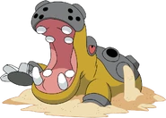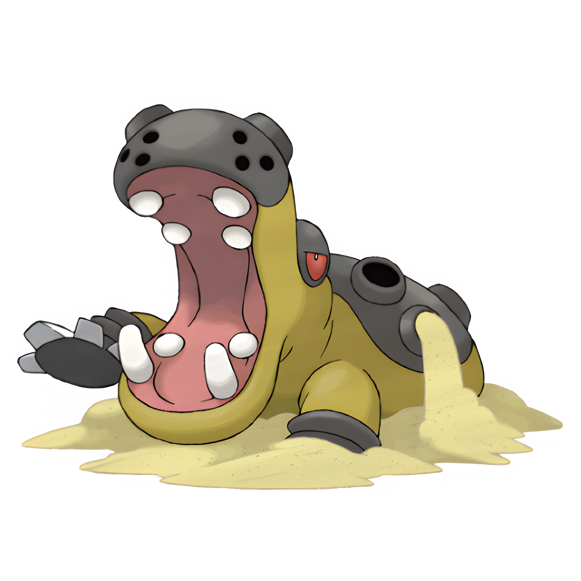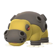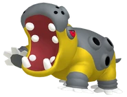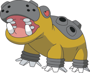 It is short-tempered and may hold its mouth agape as a display of strength. Hippowdon's massive jaws are capable of crushing cars. It has a symbiotic relationship with Dwebble, which clears any stones stuck in its ports. Drapion are known to stay away from Hippowdon. Excess sand is expelled out of Hippowdon's ports to create room for fresh sand to ingest, in order for it to stay healthy.