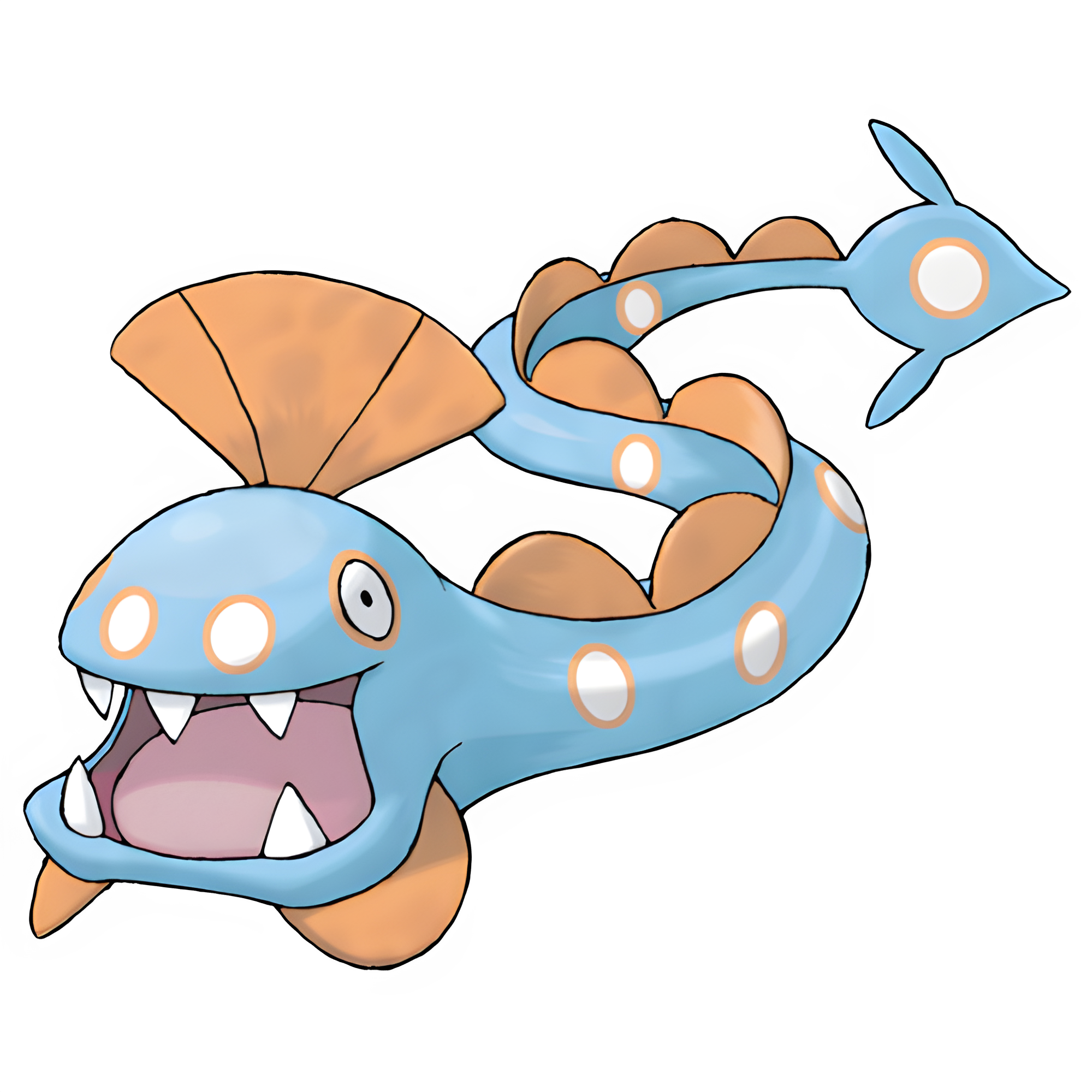 Huntail is a blue Pokémon with a long eel-shaped body. Its body is covered in circles, white in the middle and orange in the edges of the circle. It has orange fins covering its body. Its tail ends in a round shape with two small fins protruding outwards.
