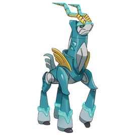 Iron Crown is an armored turquoise Pokémon resembling Cobalion. The eyes are bright digital blue and the top of it's luminous head has two yellow metal horns similar in shape to drills, with luminous patches extending from the upper half of the horn. It has a gray metal snout and a luminous blaze running from its nose to the back of its head which also has a headpiece with a circle connected by two rectangle pieces.