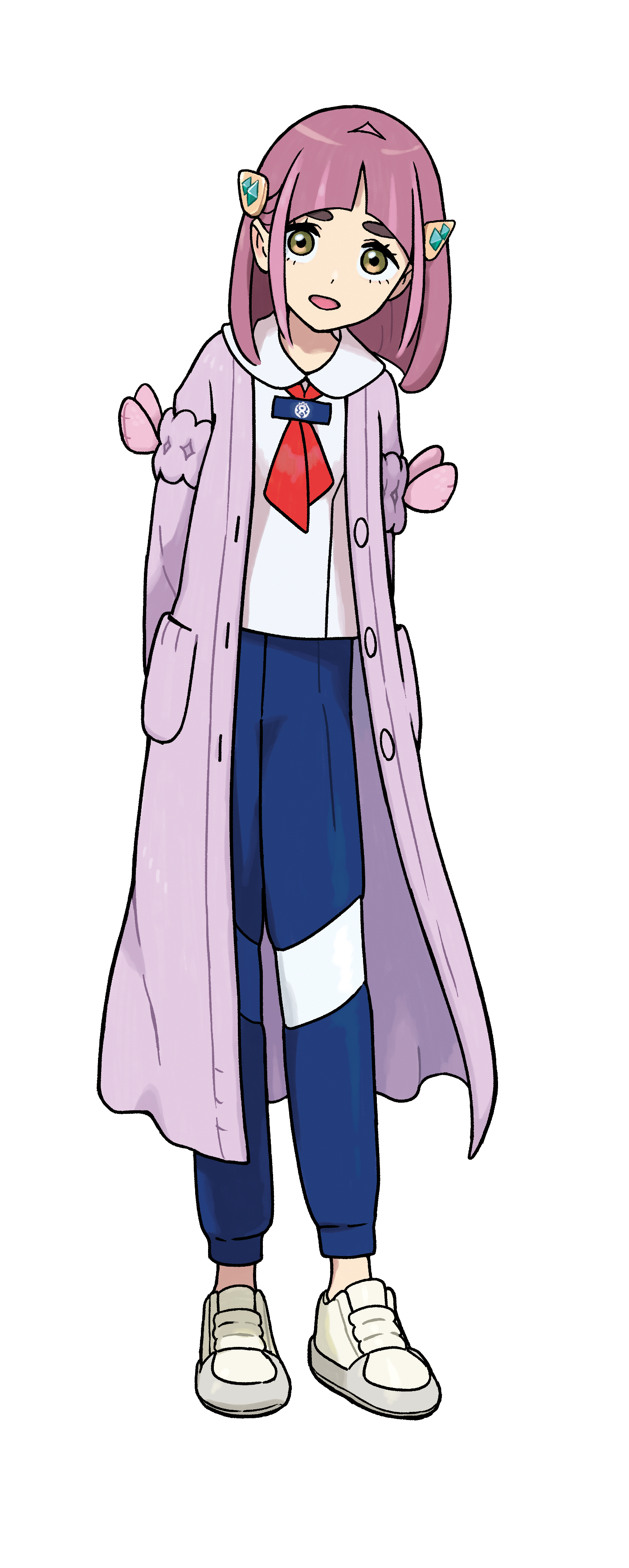 Lacey is a slender girl with fair skin, with slightly thick brows, and down turned bronze yellow eyes. Her hair is styled to be shoulder length with fringe that is evenly trimmed above her eyes. Her hair color is ash pink with lighter pink under lights, with her signature tear drop shaped gold hair clips with blue gems. Her clothes consists of the academy's white sailor collar shirt with the red neckerchief held with a blue clip, blue pants with one blue stripe and one white, with white sneakers, and red thumb less gloves. Over her uniform she wears a long lavender knit cardigan that nearly reaches the ground with three buttons, a ruffled knit design around the shoulders and bows that are meant to reference her fairy type speciality. Like her father, she is of at least partial Sinnohan descent, effectively making her the equivalent of a Japanese-American.