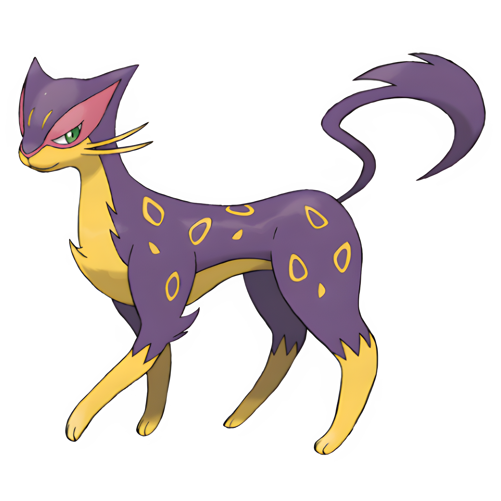 Liepard is a quadrupedal mammalian Pokémon that resembles various felines, namely a leopard, a leopard cat, and a black panther. Its body is long, slender, and lithe, with powerfully built muscles. Its coat is mainly purple with small yellow rosettes speckling its back. Its undercoat, including its legs, chest, underbelly, and much of its face, are yellow. It has vivid pink "eyeshadow" around its slanted green eyes. Two long yellow whiskers protrude from either side of its face. Like Purrloin, its tail is somewhat hook shaped.