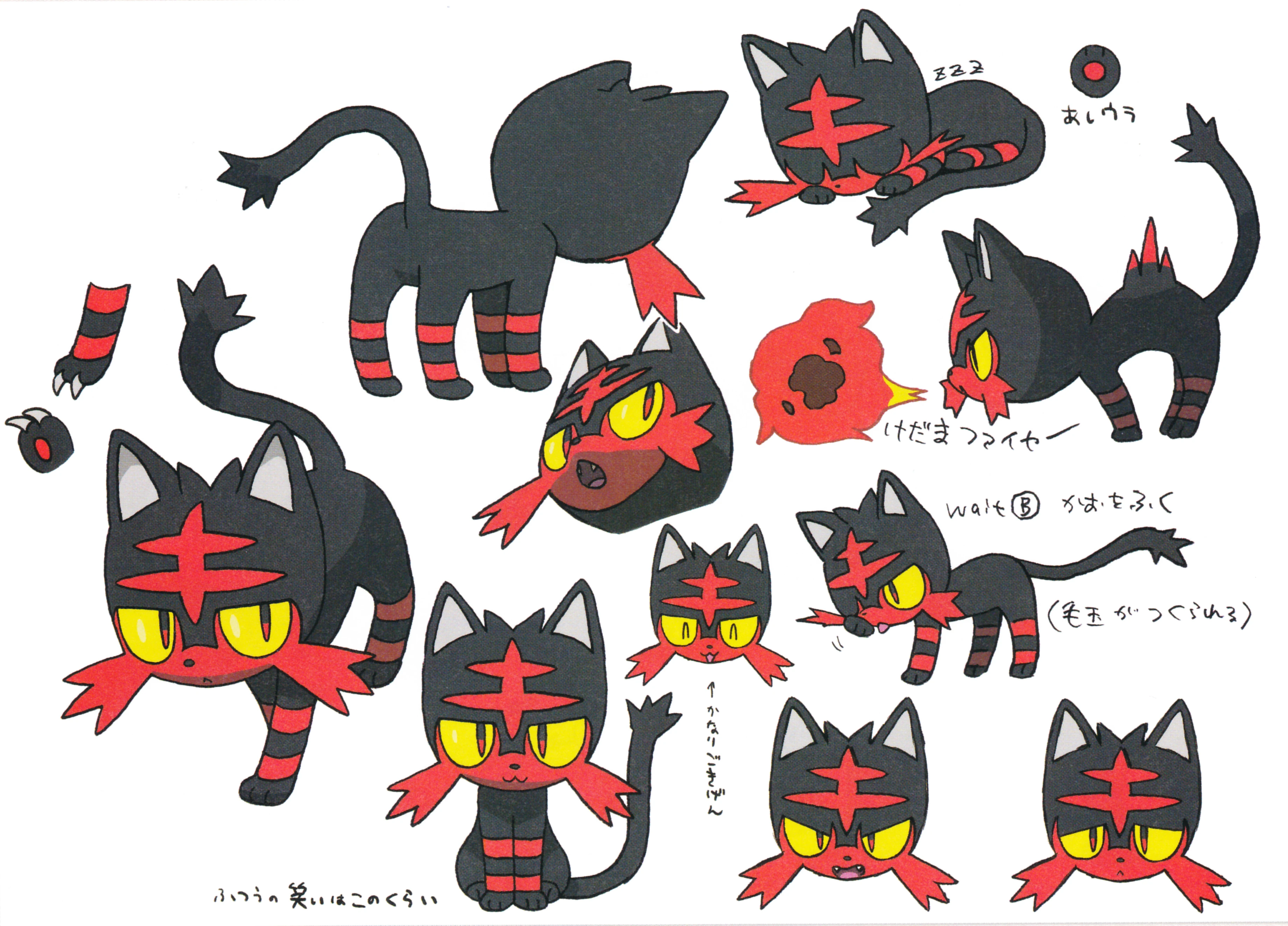 Litten is a small kitten-like Pokémon, with black fur. It has a short nose, red eyes with yellow sclera and short ears with gray insides. It has two stripes on its head with a vertical line intersecting them. The lower part of its face is red with two tufts of fur on each side. It has a long tail with a tuft of fur at the end. When it curves its back, three pointed tufts with red tips show up along the spine.