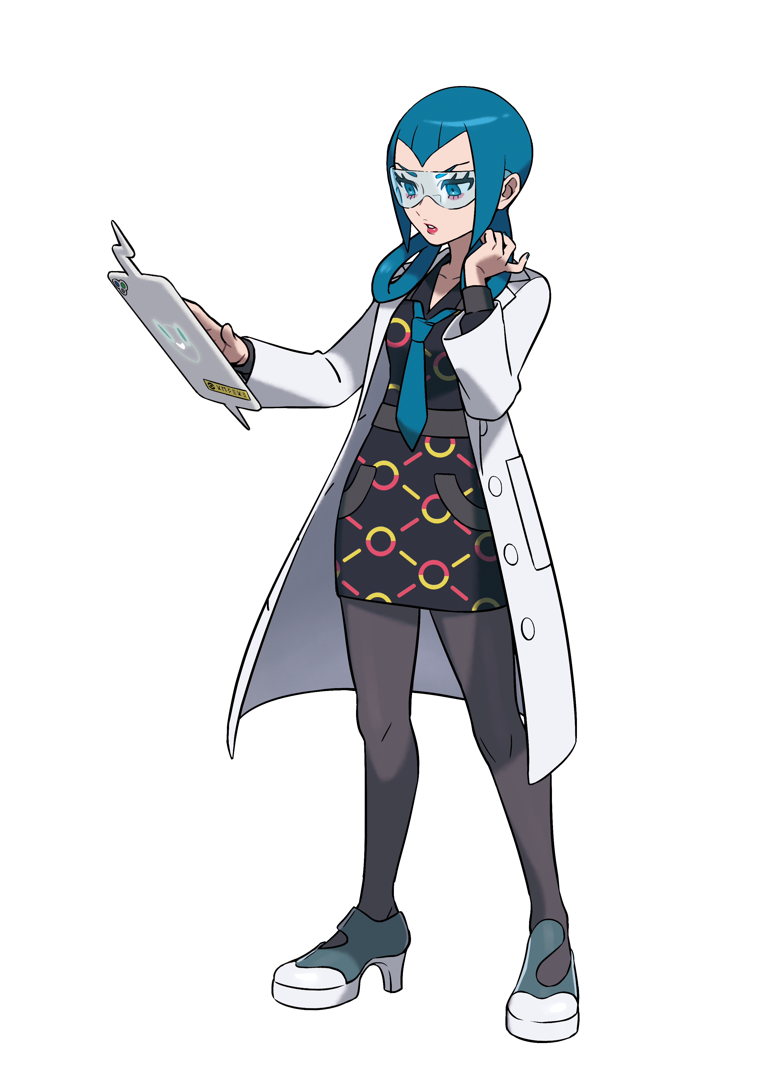 Five years, her appearance has changed a lot in her clothing as she has discarded her Team Flare outfit for a white lab coat, a black long-sleeve dress with yellow and red circle crisscross patterning, opaque black tights or stockings, gray and white shoes with heels, though she keeps her teal-blue tie from her original outfit. Her hairstyle has changed slightly with her oval-shaped pigtails now placed lower and behind her ears, her lipstick is now red instead of teal-blue, and she now wears a pair of see through glasses reminiscent of lab goggles, revealing her eyes which are the same shade as her hair and tie. She also has a white Rotom Phone which she uses to conduct her work on.