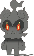 Marshadow resembles a shadow and has a wispy figure. It is predominantly black and seems to be wearing some sort of helmet. The helmet has two horn/ear-like appendages with a wispy smoke in the center. Its eyes are orange-red with an oval on top. Its arms possess a bump on each wrist. Marshadow appears to wearing a collar and its legs have a shadowy trail. It has a tiny mouth.