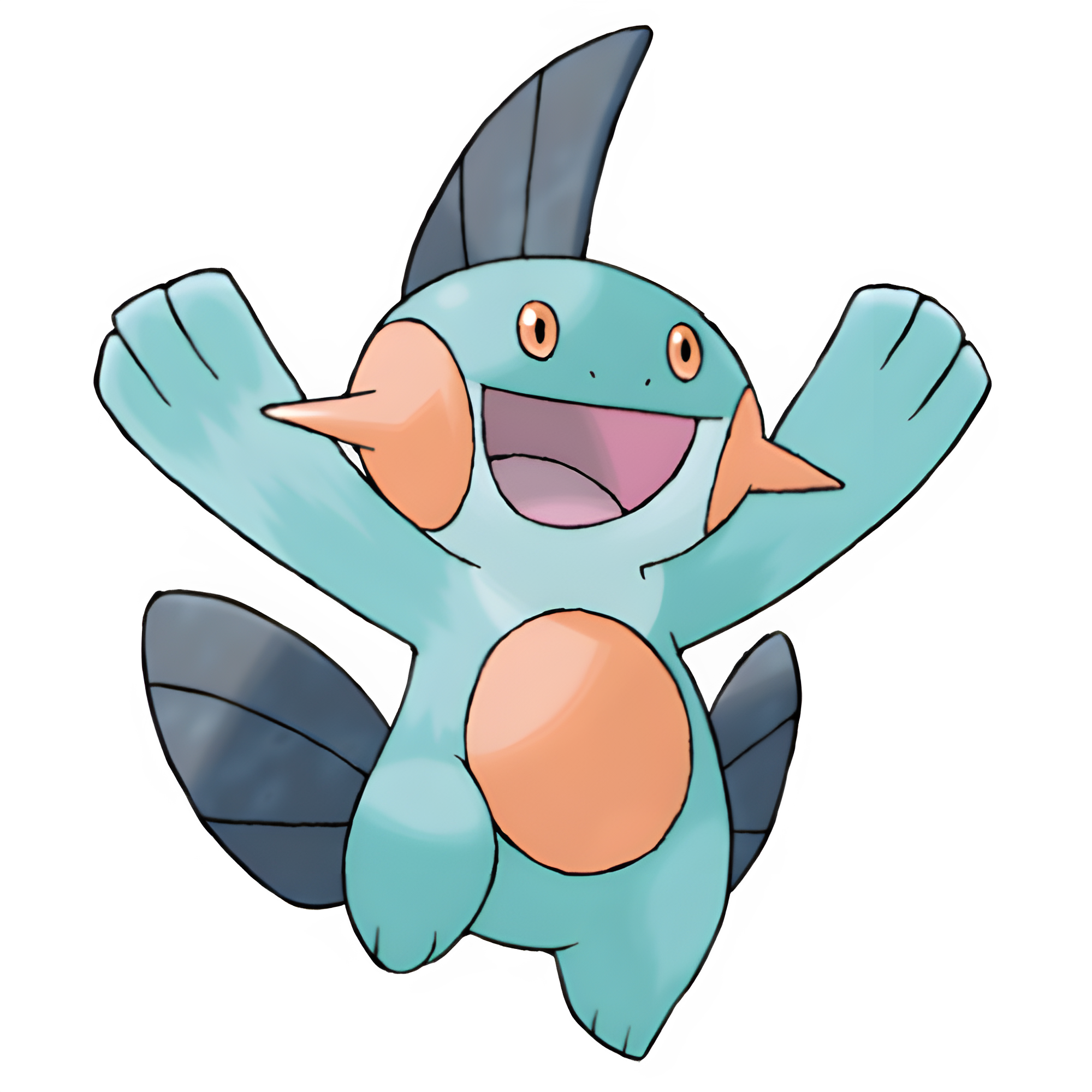 Marshtomp is a bipedal amphibious Pokémon and just like Mudkip it too resembles both a mudskipper and an axolotl. It is mainly turquoise blue with a plump orange belly and orange spikes on its cheeks. It has dark blue fins on its body: one sharply pointed one atop its head, and two rounded ones on its backside. Its chin and neck are light blue. It has long, powerful arms with fin-like fingers, and short powerfully-built legs. Its small ovular eyes are orange, and it has small nostrils.