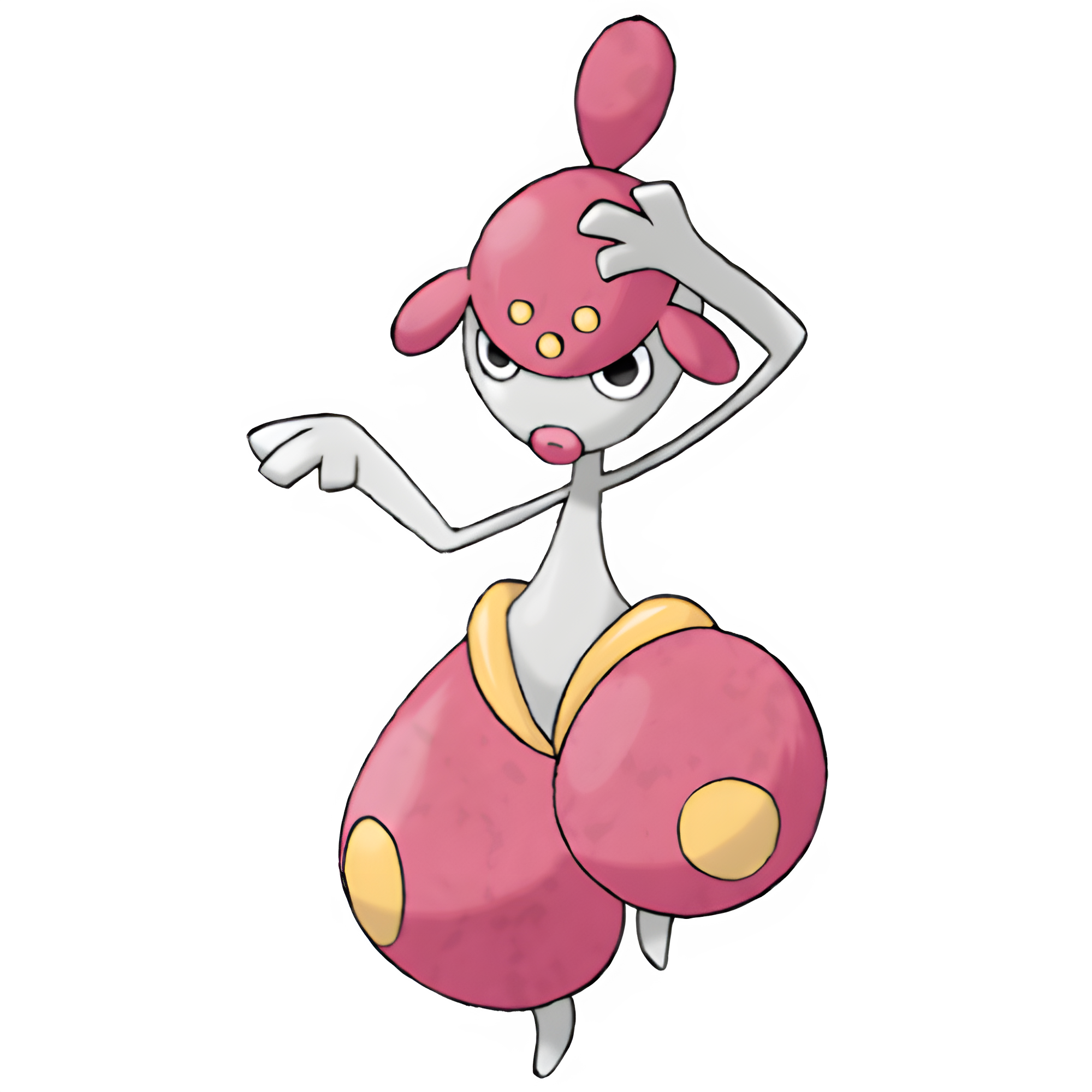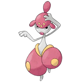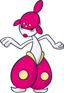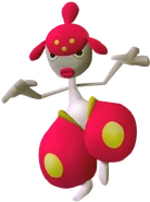 Medicham is a humanoid, bipedal Pokémon that resembles a yoga practitioner. It has a gray body with red and yellow adornments. A red headpiece with three bulb-like extensions covers the upper portion of its head: one on top and one on either side. The bulb on top is short on a female Medicham. Its large, focused eyes are slightly covered by the headpiece, and its red lips seem to be in a rounded or puckered position. Its legs appear to be covered with puffy, red pants that have a large yellow spot on the knees and yellow bands next to the hips.