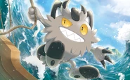 Its Galarian Form is a warrior, often showing off the dark coin on its head to others. The darker and harder its coin, the more respect it can earn from its kind. It doesn't get along with its Kantonian variant. These Meowth spent much of their lives aboard ships, helping their trainers plunder defenseless villages near beaches and rivers. When these raiders returned to their northern homes, they shared some of their stolen riches with their Pokémon.