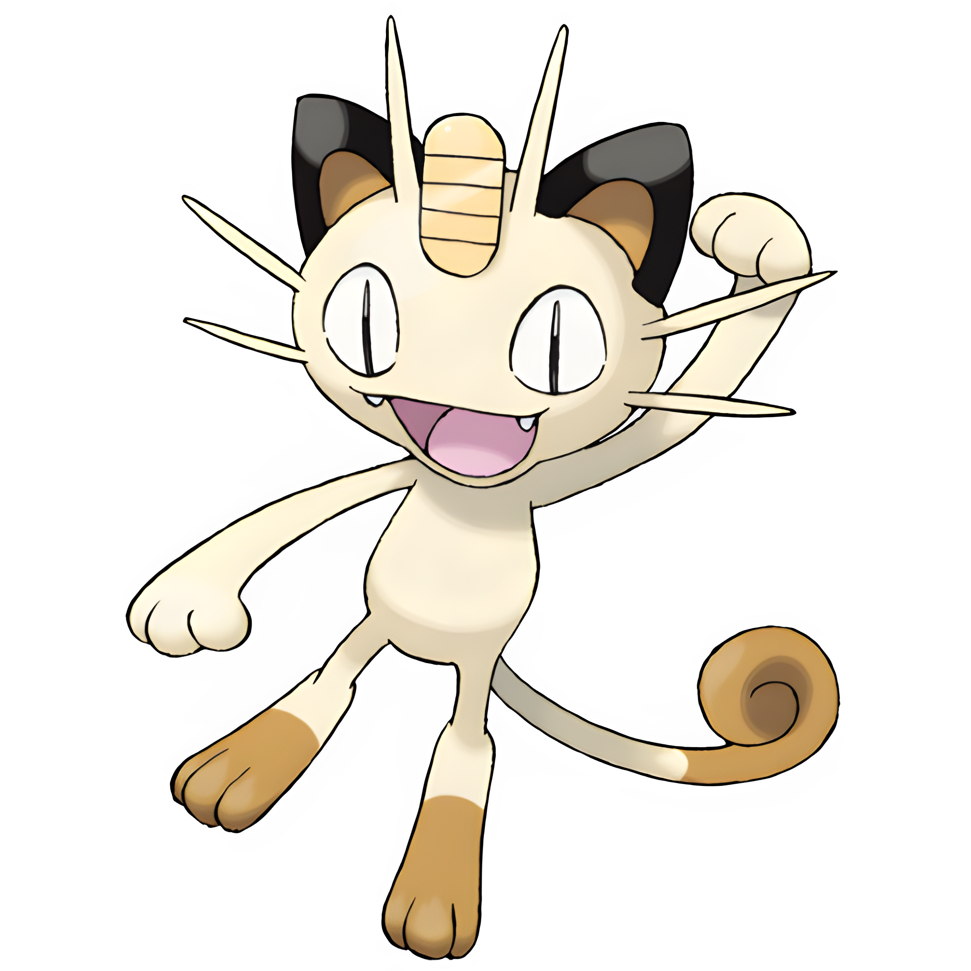 Meowth is a small, bipedal, feline Pokémon. It has two cream whiskers on each side of its oval-shaped face and two hairs sticking up on either side of the golden coin-like gem on its forehead. Meowth also has a curled tail. Meowth's tail and feet are cream-colored like the rest of it, but they are brown at the end. It has small paw pads on the undersides of its heels and toes. It is much like a Maneki Neko, a toy of Japanese descent known for bobbing its arm and hand up and down.