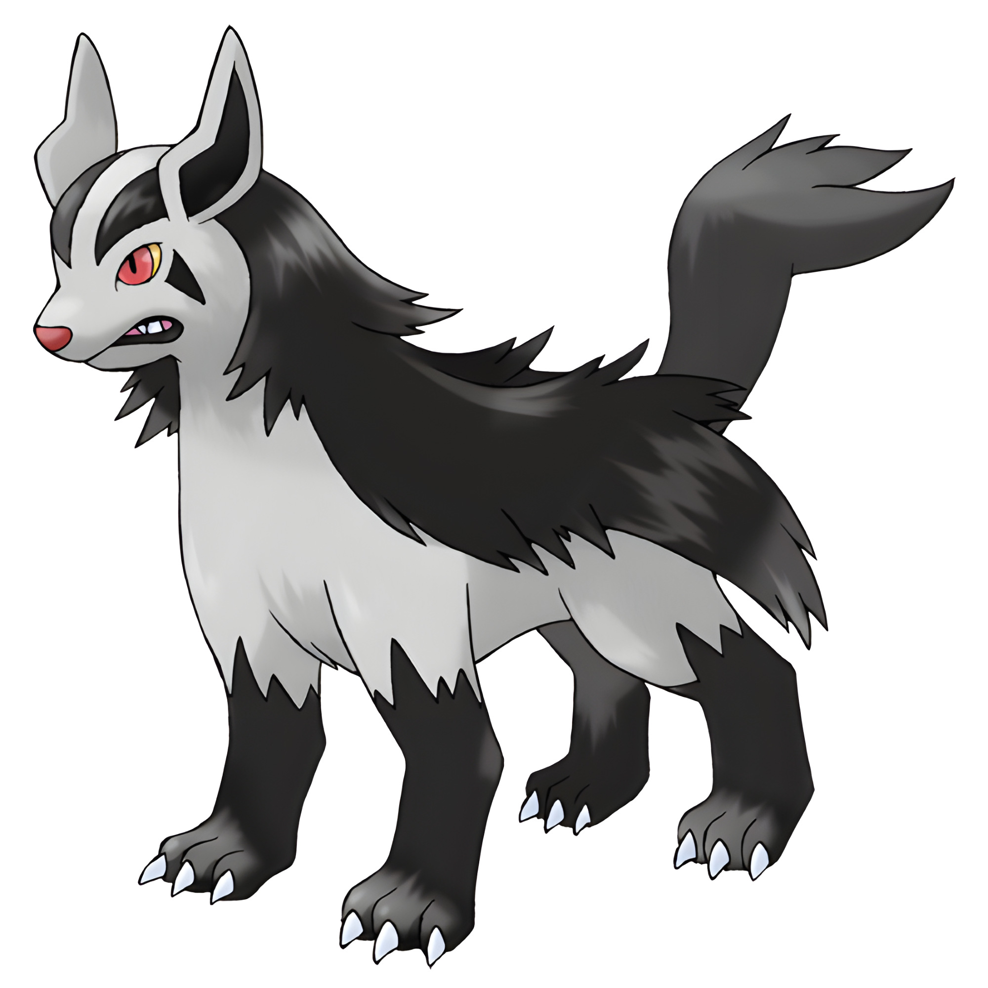 Mightyena is a large, quadrupedal and mammalian Pokémon that resembles a hyena. Its fur is mainly silvery-gray, and it has a sleek voluminous mane of long black ruffled fur extending all the way down its back, to its tail, which is also long and black-furred. It has black patches of fur below its eyes and on its forehead. Its legs are black, and it has large sharp-clawed feet. It has upright, pointed ears with black insides, bright red intimidating eyes with slit pupils, a long muzzle, and a large red nose. It has sharp fangs, seen when it opens its mouth and snarls.