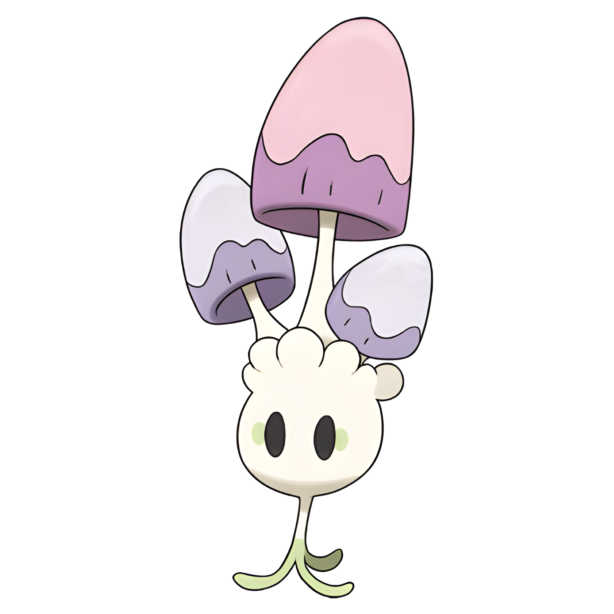 Morelull is a small, white Pokémon similar to a mushroom. It is one of the shortest Grass-type Pokémon. It has large, black eyes with pale green half-circle markings on the outer sides. Small bumps ring the top of its head, similar to hair. Its head is much larger than its thin, stem-like body. At the base, the stem splits into three green roots that act as feet. Three large mushrooms sprout from the center of its head. Each mushroom has a thin white stem and a darker ring of color around the base of the cap. The center and largest mushroom is light pink, while the other two mushrooms are smaller and a light purplish-blue. At night, Morelull can make the spores filling its mushroom caps glow.