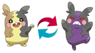 Morpeko's appearance and wheel-based signature move indicate that it may be based on a hamster or a guinea pig. Alternately, its temperamental hunger and its small nature may draw inspiration from the shrew. It may also be based on a marsupial, as it is shown to stuff food or its hands inside of the yellow/purple pouch on its body. Its dual nature with a trigger maybe a reference to Dr. Jekyll and Mr. Hyde. Its different colors (brown, yellow, and black) may be found on the incomplete dominant coloring often found with guinea pig fur. It may get its Dark typing from the fact that hamsters are often very aggressive and territorial animals.