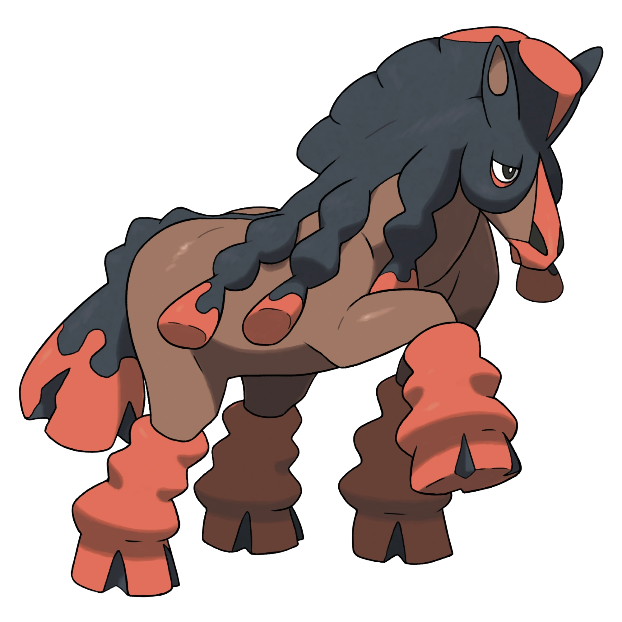 Mudsdale's large, bulky body is a chocolate brown in color. The hoofs and hair around it are orange and extends to the knees. Mudsdale's snout is orange in color. The mane is solid black with orange on the top of it. Multiple bunches of hair also come from the mane, similarly tipped with orange at the end. Its tail is black tipped with orange as well. Mudsdale appears a bit chubby, with a plump, cylindrical midsection and a thick, rounded rump.