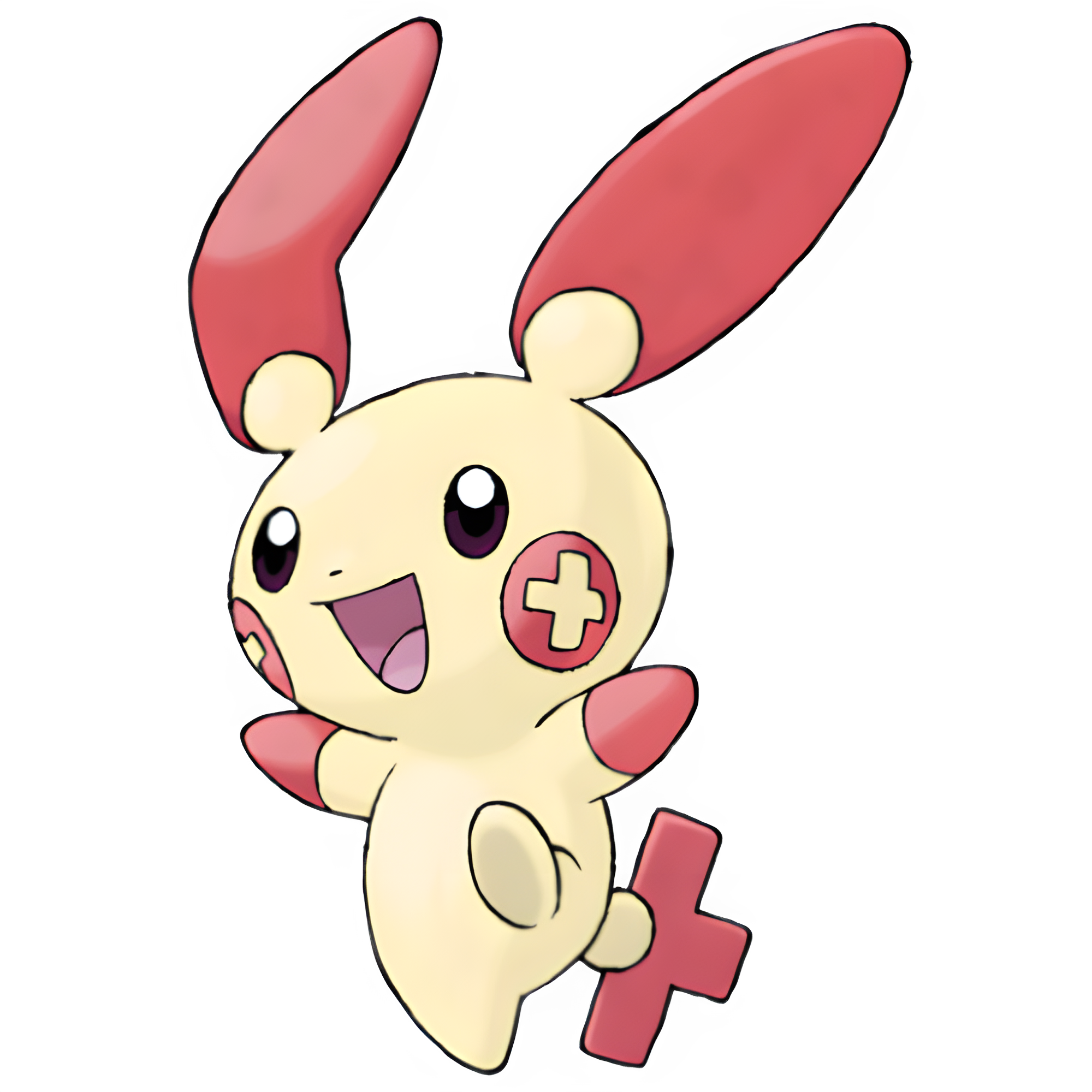 Plusle is a small rabbit or rodent-like Pokémon. It bears a remarkable resemblance to Pichu and Pikachu, and a slight resemblance to Raichu. Plusle's body is pale yellow in color, with bright red fur on its ears, cheeks, paws, and tail. Plusle have long rabbit-like ears and short tails with flat red plus signs on the end of them, while their cheeks are circular with plus signs voided in the middle.