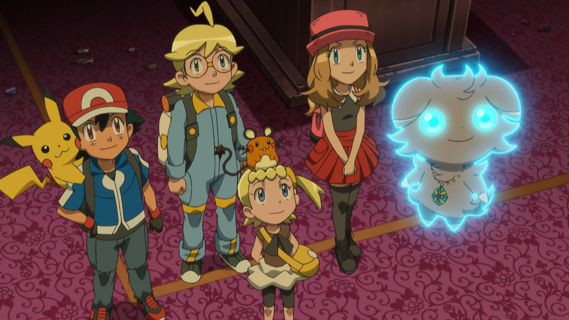 When our heroes explore the house and encounter a mysterious being with glowing eyes, Ash, Serena, and Clemont are terrified—but Bonnie runs after it to find out what’s going on, and ends up making a new friend: a Psychic-type Pokémon named Espurr! She realizes that Espurr has been responsible for all the strange happenings in the house, and that it’s keeping them from leaving for some reason. Espurr shows her the lovely pendant it’s wearing, and points out the same pendant in a portrait of an older woman, but Bonnie can’t figure out what it wants. Ash, Serena, and Clemont go searching for Bonnie and run into Team Rocket instead. They accuse each other of being responsible for the “haunting,” but when they meet up with Bonnie and Espurr, they quickly figure out what’s going on, and Meowth offers to translate for Espurr so it will let them leave the house. It seems the woman in the painting used to take care of the wild Espurr, feeding and playing with it when it came to her mansion. She even let it wear the precious pendant, a gift from her husband. But when it came back to return the pendant, the woman was gone and the house was empty. It’s been waiting in the house ever since, hoping its friend will come back for her pendant—and now it wants our heroes to help find her! Jessie, James, and Meowth have another idea: they want to catch Espurr instead. They attack, but it quickly sends the villains blasting off again. Ash and Clemont are promising Espurr that they’ll help it find the woman who lived in the mansion when the new owner of the house arrives! Her name is Elise, and the woman who took care of Espurr was her grandmother, Lacy. She tells Espurr the sad news that Grandma Lacy passed away, and offers to take it to the cemetery so it can say goodbye to her. Elise also announces her plans to renovate the old house and move in herself, and says Espurr is welcome to come and play any time. It’s a bittersweet ending to Espurr’s long quest, as our heroes say their farewells and continue their journey to Cyllage City. | ||||
