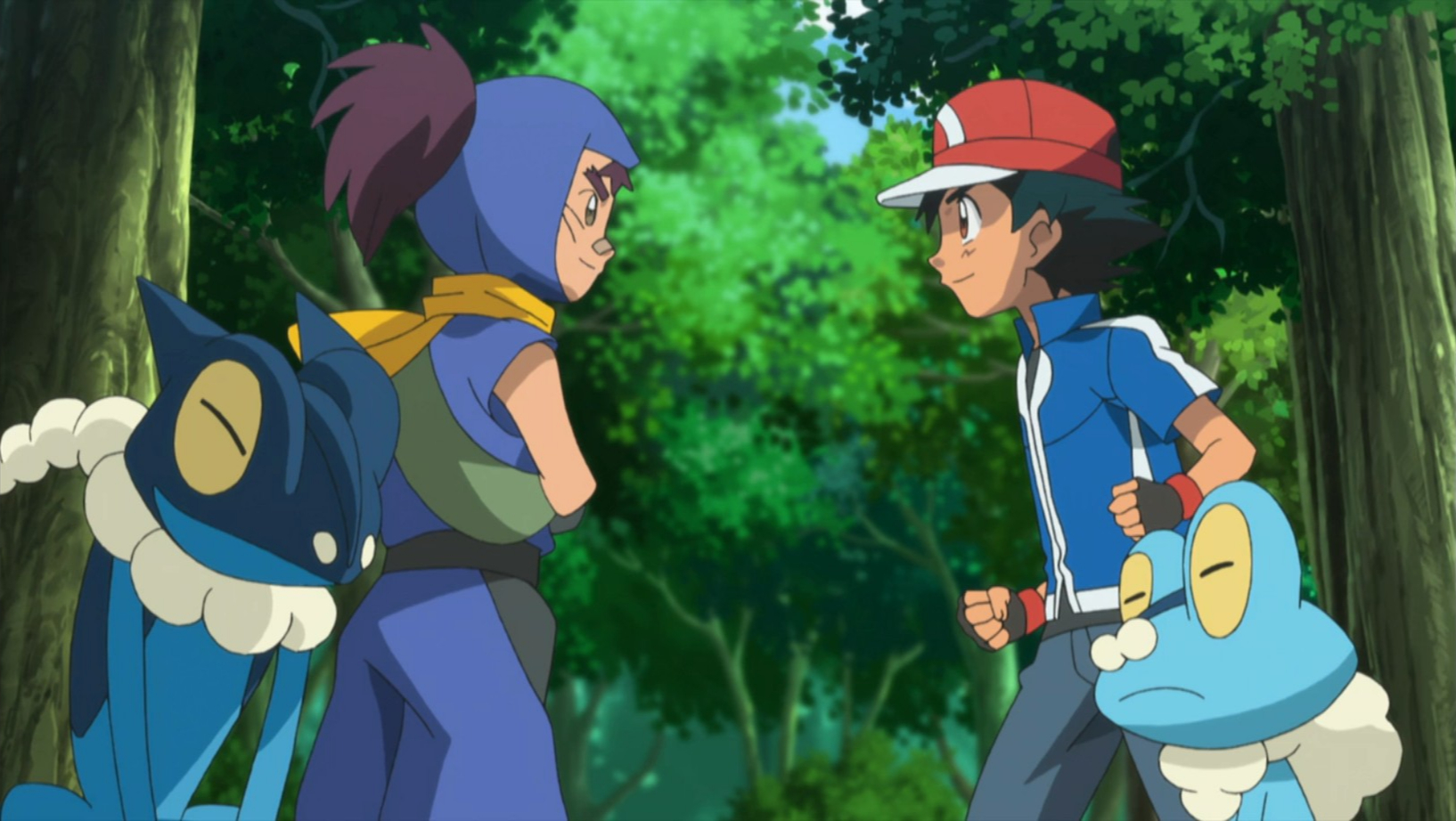 The scheduled events resume with Team Froakie (Ash, Serena, and Clemont) and Team Squirtle (Tierno, Shauna, and Trevor) facing off in the finals of the Team Battle competition, where the three members of each team have to work together and combine their Pokémon’s moves. As before, Tierno’s rhythmic battling style poses quite a challenge! Team Froakie manages to come out on top, but Ash is so impressed that he asks Tierno for some special training. The next morning, it’s time for the friends to go their separate ways, but they make plans to meet up again soon. Now, our heroes are off once more to Shalour City! | ||||