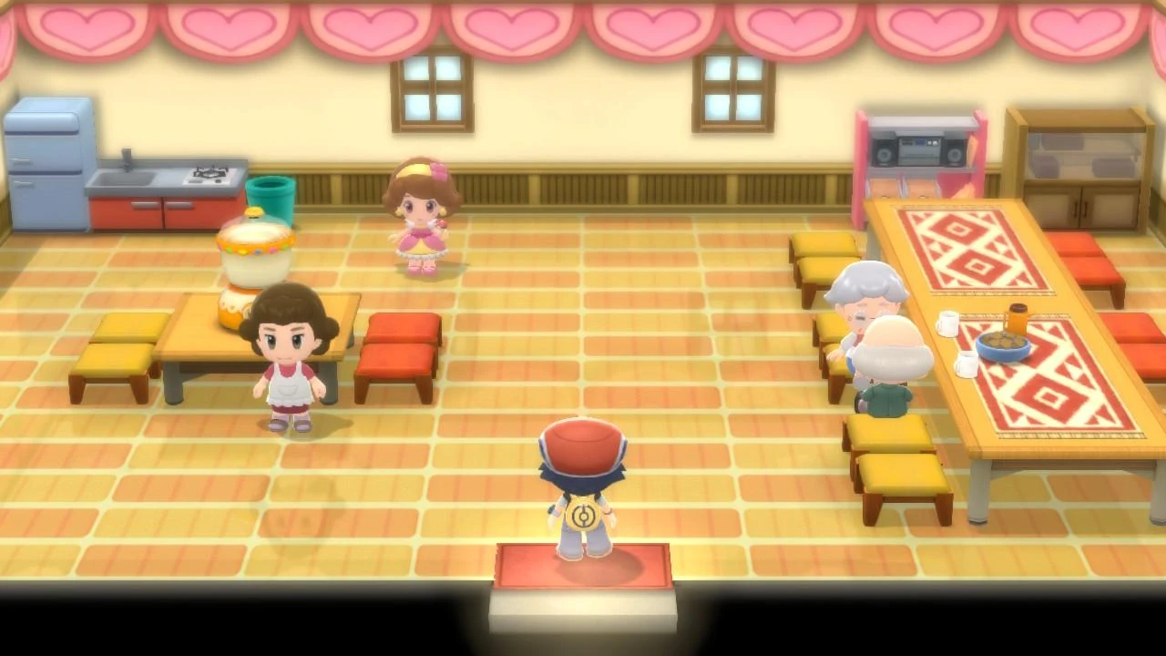 There are four non-playable characters. Two of them are elders who sit at two chairs at the main table, talking about Poffins. A young woman is to the north, and she provides some advice. There is also a woman next to the Poffin-making machine, whom the player must talk to before they can start making Poffins. Additionally, a reporter for Jubilife TV is sometimes right next to the entrance.