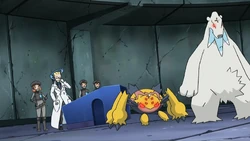 Meanwhile, our heroes are heading for the White Ruins via Floccesy Town when they are attacked by three angry Amoonguss! Ash, Iris, and Cilan fight them off and then take them to the Pokémon Center, where they find the place is packed! Nurse Joy explains that many of the mountain Pokémon have been coming into town and attacking people for no apparent reason, and a Trainer mentions that he’s seen some strangers hanging out at an abandoned observatory near the peak. Ash and the others set out to investigate, and they’re headed up the mountain when a bearded fellow advises them not to go any farther because it’s too dangerous. He’s quickly proven right when all the Pokémon in the area—including Pikachu and Axew—suddenly turn on the group and start attacking! The man produces a device that shields the Pokémon from the harmful EM waves, and as they calm down, he removes his disguise: it’s Detective Looker of the International Police, last seen chasing down Team Galactic in the Sinnoh region, and now on the trail of Team Plasma! He’s tracked them to the abandoned observatory, and naturally, our heroes decide to come along and help. When they confront Team Plasma inside the observatory, Colress decides that Pikachu would be the perfect subject for his experiments. It’s a tense moment as Pikachu struggles against the control of Colress’s machine...but the bond between Ash and Pikachu is stronger than any EM wave, and Pikachu breaks free. Colress is marveling at this development when he notices a strange device plugged into his machine, stealing his data: it’s Team Rocket! They grab some of the equipment, which frees all the mountain Pokémon from the scientist’s influence, and flee in their balloon. But a missile from Team Plasma’s airship sends them blasting off again. Looker realizes that the remaining equipment is set to self-destruct, and quickly gets everyone out of the building before the observatory blows up, destroying all evidence of Team Plasma’s presence and Colress’s experiments. He vows to get to the bottom of Team Plasma’s villainous plot, and Ash and the others wish him well as he departs and they resume their journey to the White Ruins. | ||||