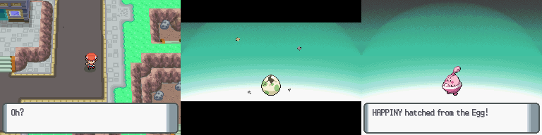 The process of a Happiny hatching in Pokémon Diamond Version and Pokémon Pearl Version