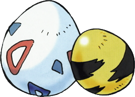 Artwork of two Pokémon Eggs, particularly one of Togepi (left) and the other of Elekid (right)