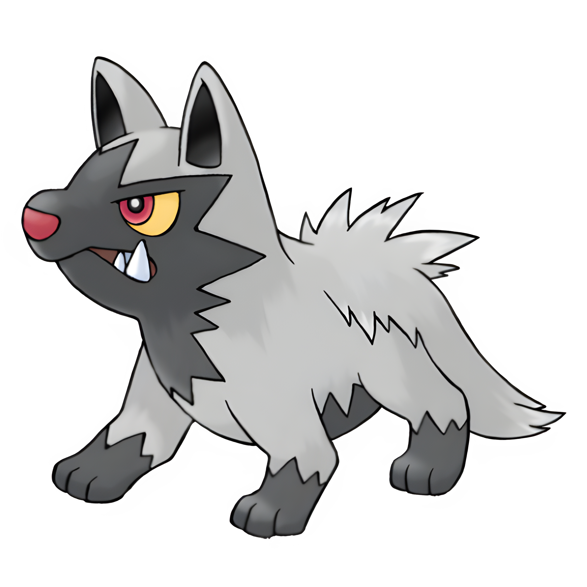 Poochyena is a small, quadruped hyena-like Pokémon. Its scruffy, unkempt fur is mostly gray in color. It has dark gray fur on its face, underbelly, and paws, as well as inside its pointed ears. It has a long snout, a red nose, and red eyes with yellow scleras. It has sharp fangs, which it bears when angered.