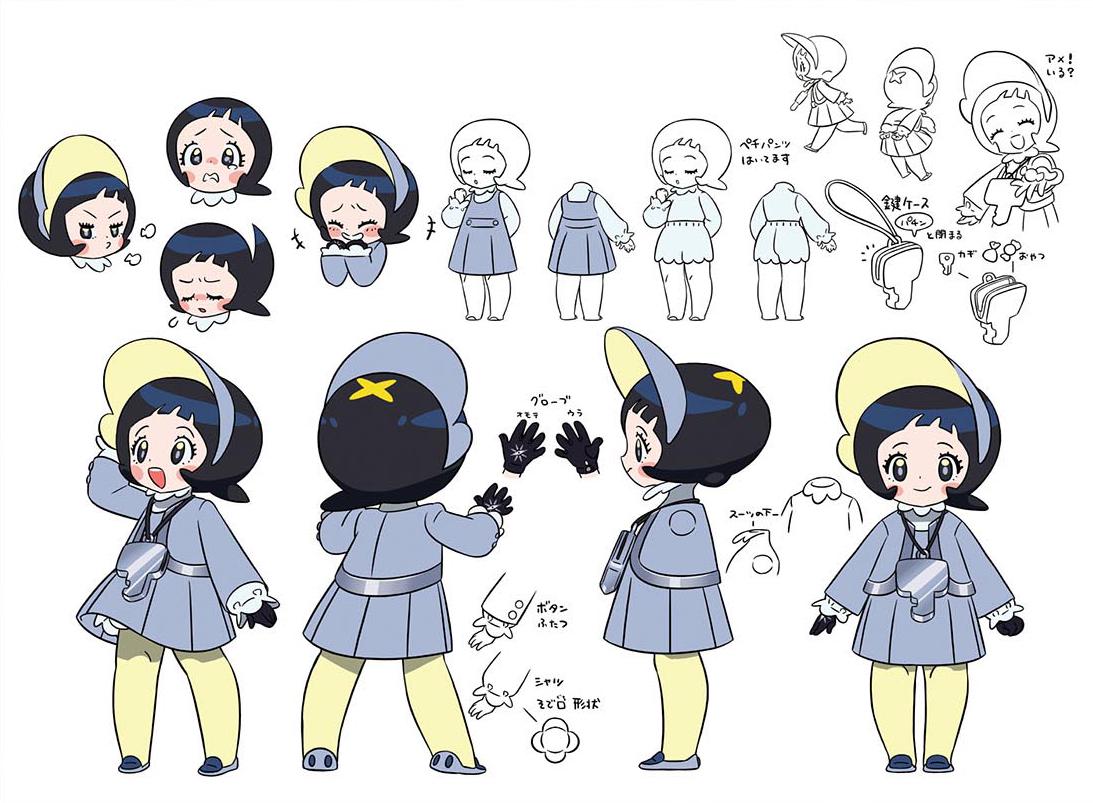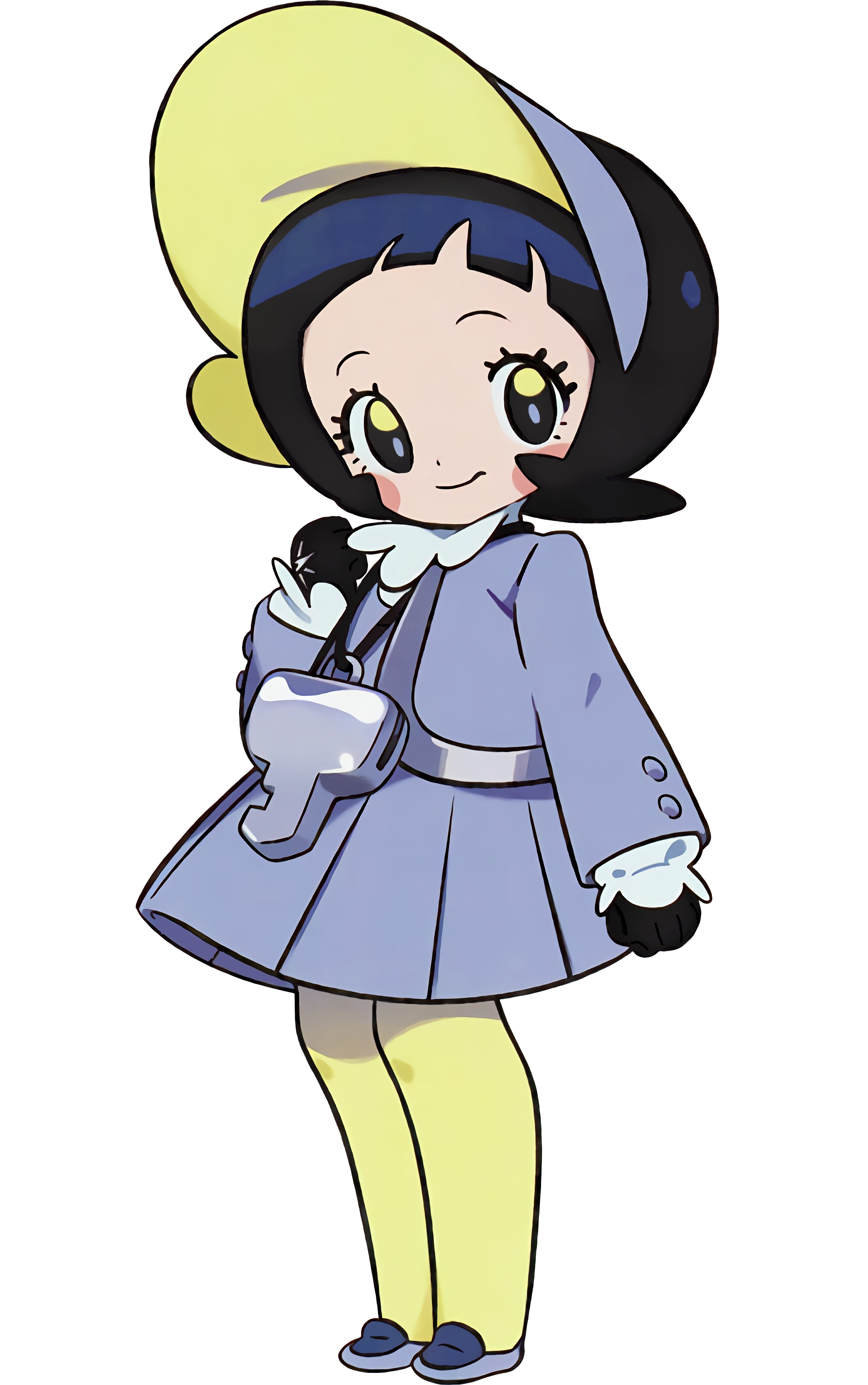 Poppy is a short and small girl with black and yellow hair and eyes. She wears a blue bonnet with a matching jacket and dress, yellow pantyhose, blue shoes and black gloves. She also wears a necklace with a key on it and has blush stickers on her cheeks, symbolizing her happy personality. The Steel locket and the metallic silver coloring of her clothing reflects her Steel-type preference.