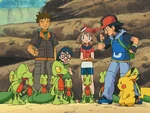 The Treecko goes away in other direction, though Ash is confident Treecko would return soon, since this is its home. May, Brock and Max have lunch, having no idea what Ash and Pikachu are doing. Max asks May how can she be hungry if Ash and Pikachu might be in danger. May threatens Max and wonders if he isn't going to eat his food. Brock believes as long as Pikachu is with Ash, they are fine, promising they could search for them after they would eat their dessert. Seeing the sun's dusk, Ash realizes he lost track of time. Since he still wants to catch Treecko, Ash sends Taillow and dismisses it to find and lead Brock, May and Max to him, while he waits for Treecko. The Treecko comes with water, pouring the water to the tree's roots and setting a bush near it. Treecko repeats the process several times again, with Ash and Pikachu watching it doing.