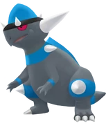 Rampardos is a large, bipedal, dinosaur-like Pokémon. Like its pre-evolved form, Cranidos, it is based on the real life Pachycephalosaurus, having long hindlimbs and short forelimbs, and also having an extremely thick skull roof. Its eyes are dark red and very close to the blue dome on the top of its head. There is less blue on it then Cranidos but there are some rings of blue on its wrists, neck It has several spikes covering it including its head, knees, neck and two very small spikes near the tip of its nose.