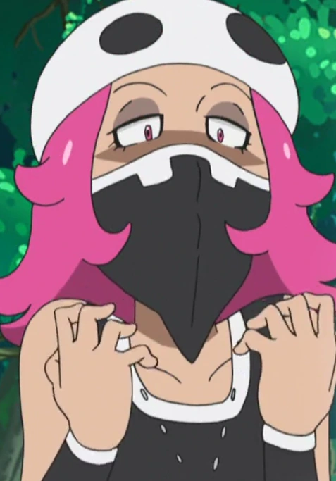 Rapp wears gang clothes which were made and owned by the Team Skull grunts themselves. Her clothes are mainly black, with a skull helmet and their emblem hanging from a necklace/chain. She has pink hair.