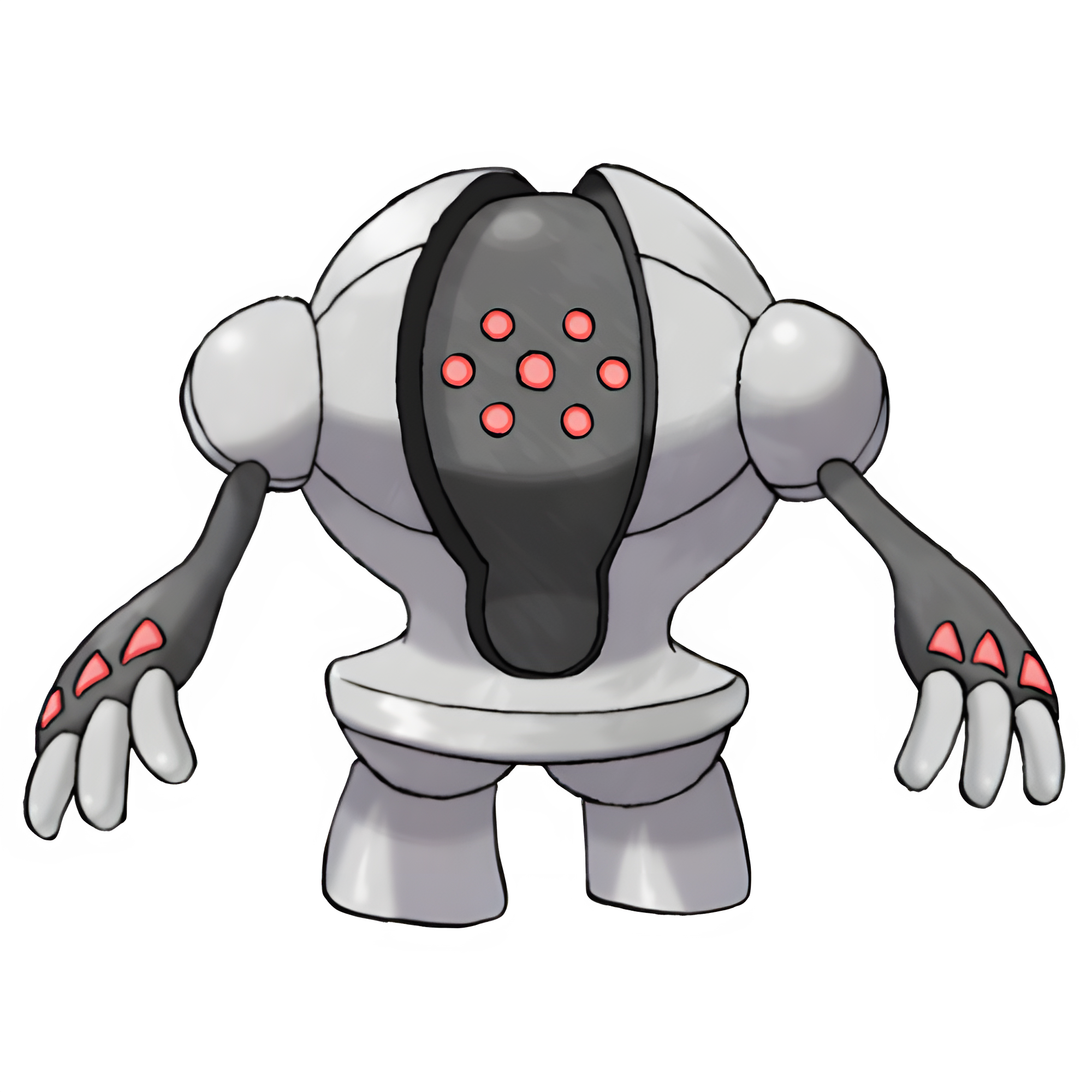 Registeel is a silver and dark gray Pokémon with seven red dots on its face and a short, bulky body. It has small stubby silver feet and hands with three fingers. It also has three small red triangles on its knuckles.