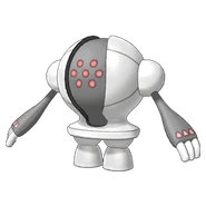 It is speculated that Registeel was created from the metals found in fallen meteorites, which Regigigas then tempered underground. Along with its brethren, Registeel is fabled to have stopped the eruption at modern Snowpoint City before being sent away to Hoenn, where it was locked away for being too powerful. It is said to have transformed into a pillar of iron as it waited. Registeel communicates by flashing the lights on its head in varying patterns. To date, no one knows how Registeel or the other Regis feed, as all of them lack mouths or other orifices through which food may enter their bodies; they may not eat at all.