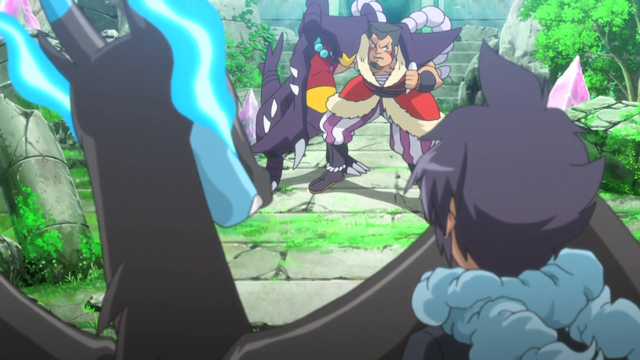 Remo challenged Alain for a battle to get the Mega Stone Alain has found. Remo sent out his Garchoo and let it Mega Evolve with the use of the Mega Stone placed in his parasol. Alain sent out his Charizard and let it Mega Evolve as well. Remo didn't understand Alain though when he said that he had a dragon-type Pokémon as well. Garchoo gave a tough fight against Alain's Mega Charizard but Mega Charizard was able to win the battle, knocking Garchoo out. Remo retrieved his Garchoo and let Alain have the Mega Stone as he has won the battle. Alain explained to Remo that when his Charizard Mega Evolved, its flying type exchanged for dragon-type, clearing Remo's confusion he had earlier.