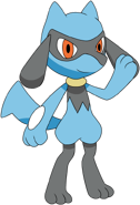 Riolu is a black and blue, dog-like Pokémon nearing two and a half feet. Its appearance is similar to its evolved form Lucario, though there are some differences. Its legs and torso are colored black while its head, lower body and tail are blue. Riolu have large, rounded bumps on the backs of its forepaws, placed in a similar fashion to Lucario's spikes. Riolu also have a black "mask" with two black appendages on either side, and red eyes.