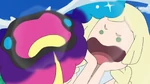 - The Poké Problem segment is hosted by Lillie and asks, "My mother appears in today's episode, but who is that?". The answers are Lusamine (blue), Wicke (red), Professor Burnet (green), and Olivia (yellow). The correct answer is the blue one, Lusamine.