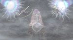 Ash and his Pikachu are in the foggy mountains. Ash follows Pikachu to a strange place, where the floor crumbles under his foot. Pikachu watches as two portals opens, from which two strange Pokémon appear - a purple one with large wings and a white one with orange markings. Ash identifies them to be Solgaleo and Lunala, whom Ash understands and makes a promise. The two Legendary Pokémon disappear and emit two beams, which form a cloud-like being. Tapu Koko, Tapu Lele and two other Tapu Pokémon are alerted of this. At the caves, Gladion is trying to restrain his odd-looking Pokémon when it gets angry. He tries to tell it must not be revealed to other people. Suddenly, the Pokémon stops, and Gladion praises it, but exclaims there could be an Ultra Beast around.
