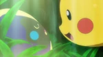 At night, Nebby wakes up and crawls to the ladder. Pikachu notices this and tries to stop it, but falls down. Nebby is amused by this foolish behavior.